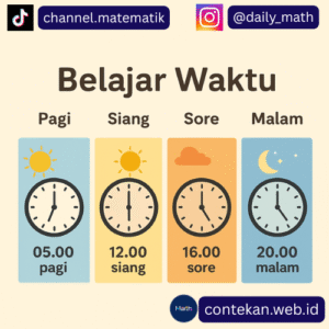 Materi “Belajar Waktu: Pagi, Siang, Sore, Malam” dalam matematika tidak hanya mengenalkan nama-nama waktu dalam sehari, tetapi juga bagaimana cara menyatakan waktu lewat notasi 12 jam atau 24 jam, serta melakukan operasi hitung satuan waktu (penjumlahan, pengurangan, konversi). Dengan contoh-contoh sederhana di atas, siswa dapat memahami cara menghitung durasi kegiatan atau menjumlahkan waktu secara praktis.