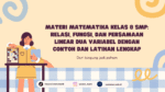 Memahami Hubungan Antar Variabel sebagai Dasar Berpikir Logis Matematika kelas 8 adalah tahap penting di mana siswa mulai memahami hubungan antar nilai, bukan hanya menghitung angka. Di sinilah konsep seperti relasi, fungsi, dan sistem persamaan mulai diperkenalkan secara lebih serius. Materi ini sangat penting karena menjadi dasar untuk matematika kelas 9 hingga SMA. Jika dipahami … Continue reading Materi Matematika Kelas 8 SMP: Relasi, Fungsi, dan Persamaan Linear Dua Variabel dengan Contoh dan Latihan Lengkap