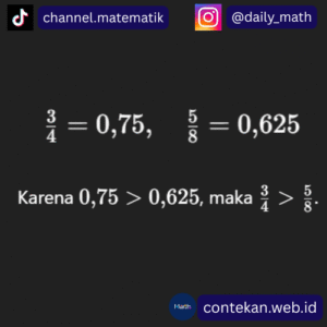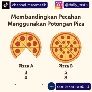 - Pizza A dibagi menjadi 4 potongan sama besar, dan kamu makan 3 potong → bagianmu adalah 3/4.