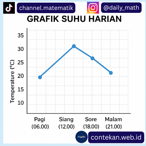 Jika data tersebut digambarkan dalam grafik garis, maka titik-titik (06.00, 24), (12.00, 32), (18.00, 28), dan (21.00, 26) dihubungkan membentuk sebuah kurva perubahan suhu. Dari grafik tersebut dapat terlihat bahwa suhu tertinggi terjadi pada siang hari, dan menurun kembali pada sore hingga malam.