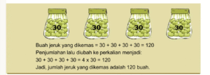 Jika kita memiliki 4 kantong, masing-masing berisi 30 jeruk, maka jumlah jeruk seluruhnya dapat dihitung dengan penjumlahan: