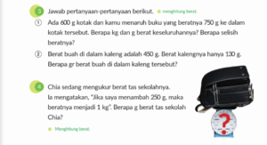“Ada 600 g kotak dan kamu menaruh buku yang beratnya 750 g. Berapa kg dan g berat keseluruhannya? Dan berapa selisih beratnya?”Penyelesaian:- Total berat = 600 g + 750 g = 1350 g