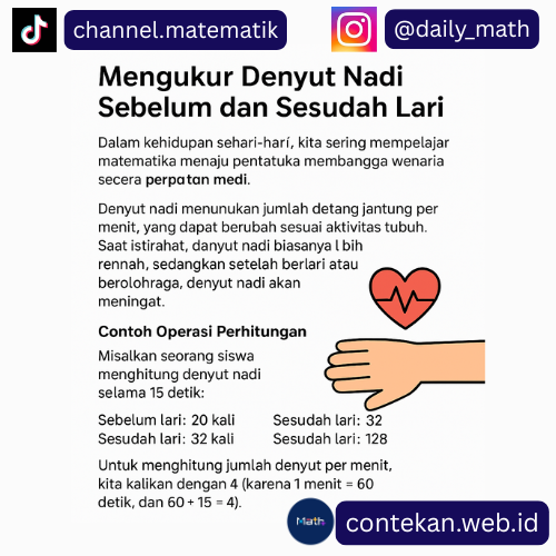 Dalam kehidupan sehari-hari, kita sering mempelajari matematika melalui kegiatan sederhana. Salah satunya adalah dengan mengukur denyut nadi sebelum dan sesudah lari. Denyut nadi menunjukkan jumlah detakan jantung per menit, yang dapat berubah sesuai aktivitas tubuh. Saat istirahat, denyut nadi biasanya lebih rendah, sedangkan setelah berlari atau berolahraga, denyut nadi akan meningkat.