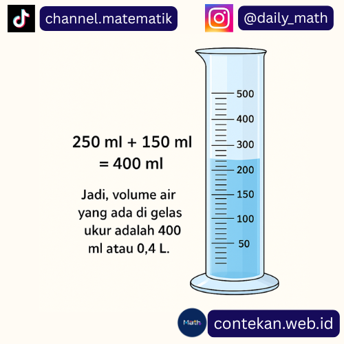 Andi memiliki gelas ukur. Ia menuangkan air hingga mencapai 250 ml. Kemudian ia menambahkan lagi air sebanyak 150 ml.