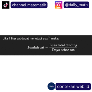 Menghitung kebutuhan cat untuk mengecat dinding adalah salah satu penerapan matematika dalam kehidupan sehari-hari. Konsep yang digunakan biasanya berupa luas persegi panjang dan operasi pembagian. Dengan cara ini, kita dapat memperkirakan berapa banyak kaleng cat yang harus dibeli agar hasil pengecatan optimal dan tidak boros.